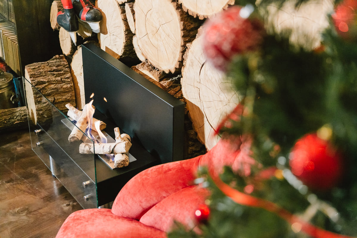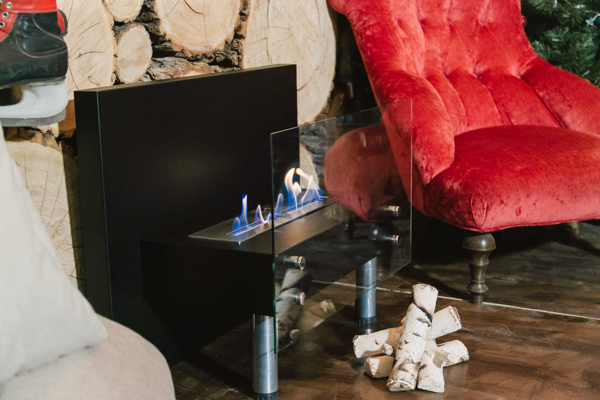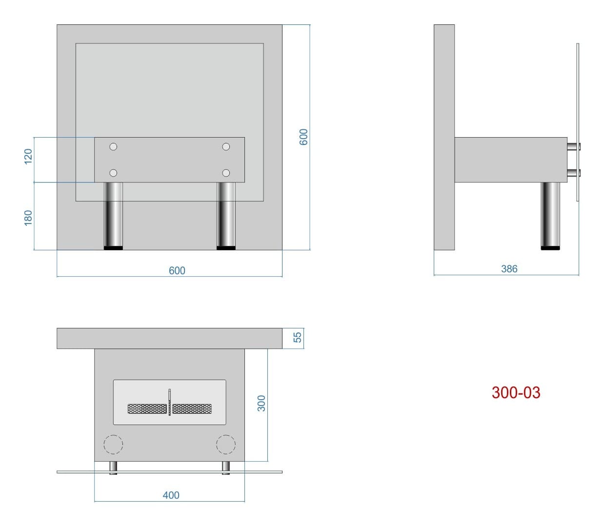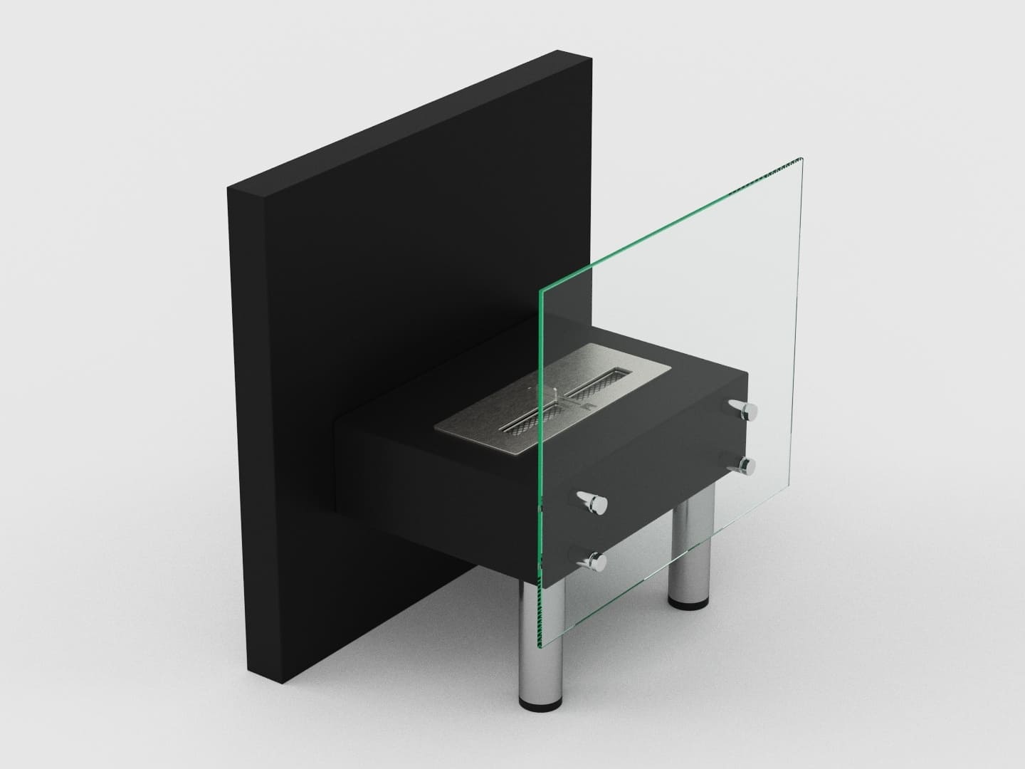 Представляет собой сборный металлический каркас с топливным блоком Lux Fire 300 М, закрепленный на 4 дистанционных держателях к защитному стеклу с упором на мебельные ножки.