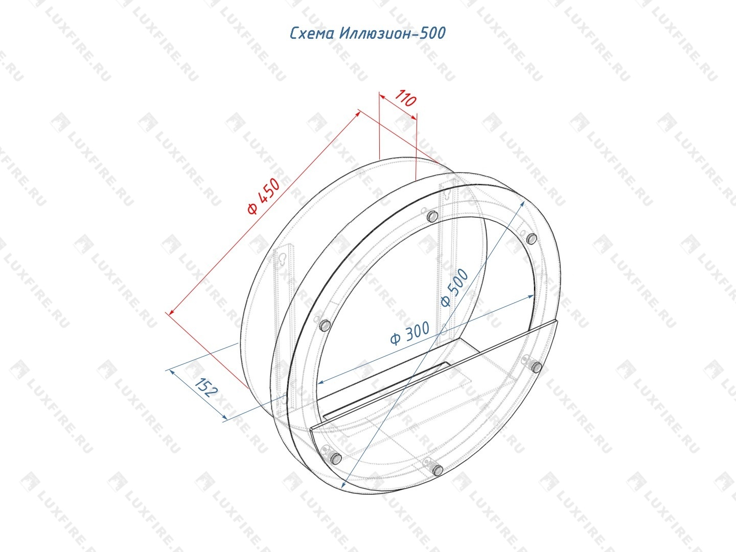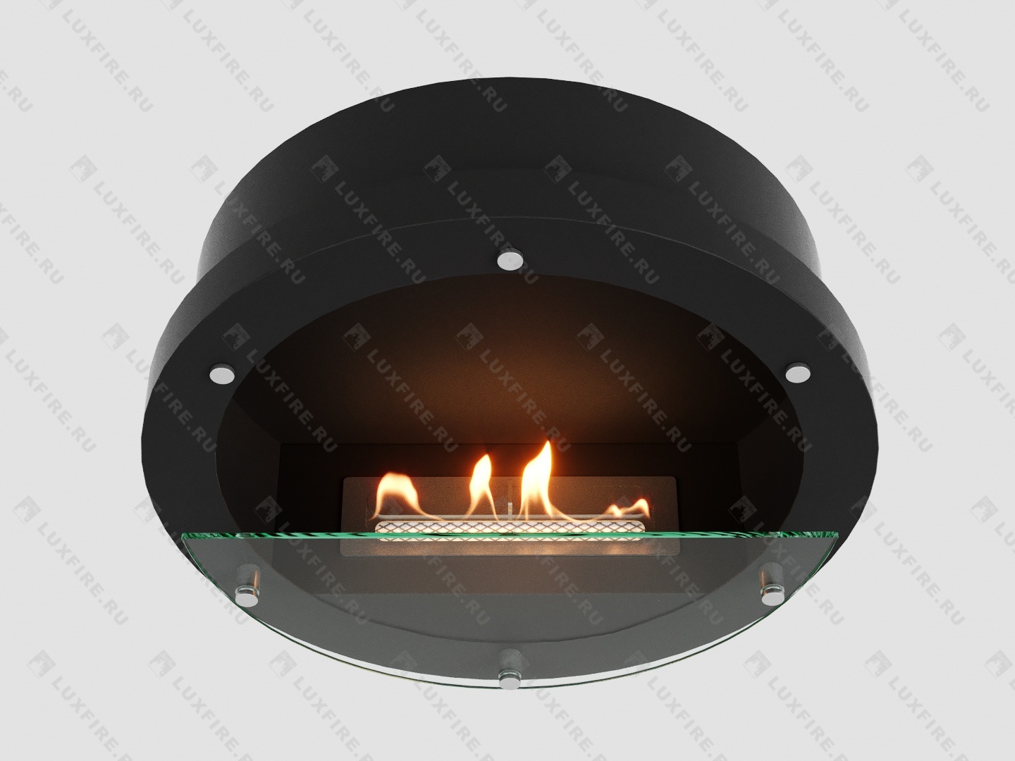 Представляет собой настенную сборную металлическую конструкцию круглой формы класса XS в виде кольца , создающую полузакрытое безопасное пространство для огня с топливным блоком Lux Fire 250 XS ограниченную закаленным стеклом в котором горит живой огонь с углом обзора 180 градусов. Универсально подходит для встройки в нишу или подвеса на стену.