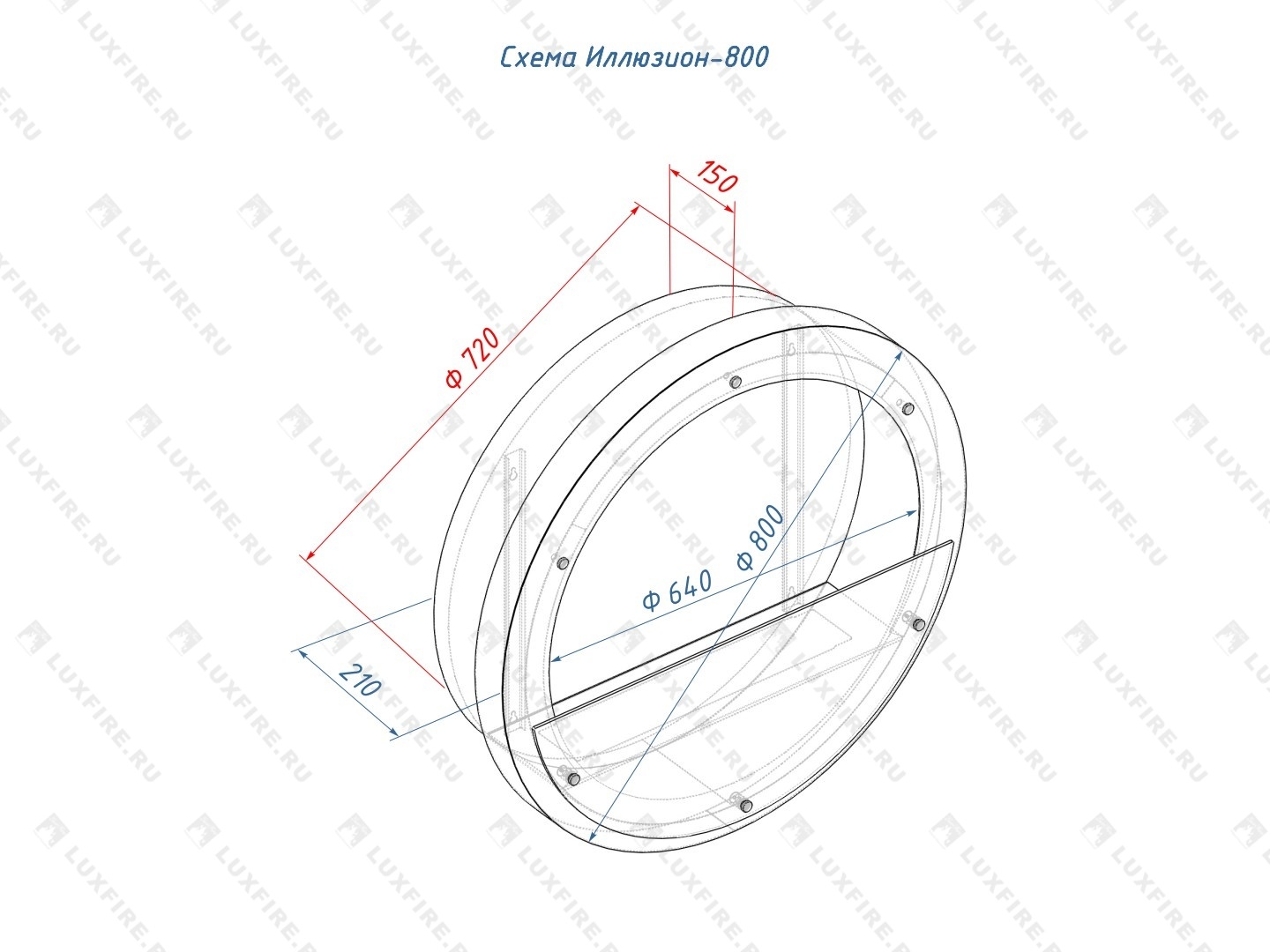 Представляет собой встраиваемую сборную сквозную металлическую конструкцию круглой формы класса S, создающую полузакрытое безопасное пространство для огня с топливным блоком Lux Fire 500 S ограниченную закаленным стеклом в котором горит живой огонь с углом обзора 180 градусов. Универсально подходит для встройки в нишу или подвеса на стену.