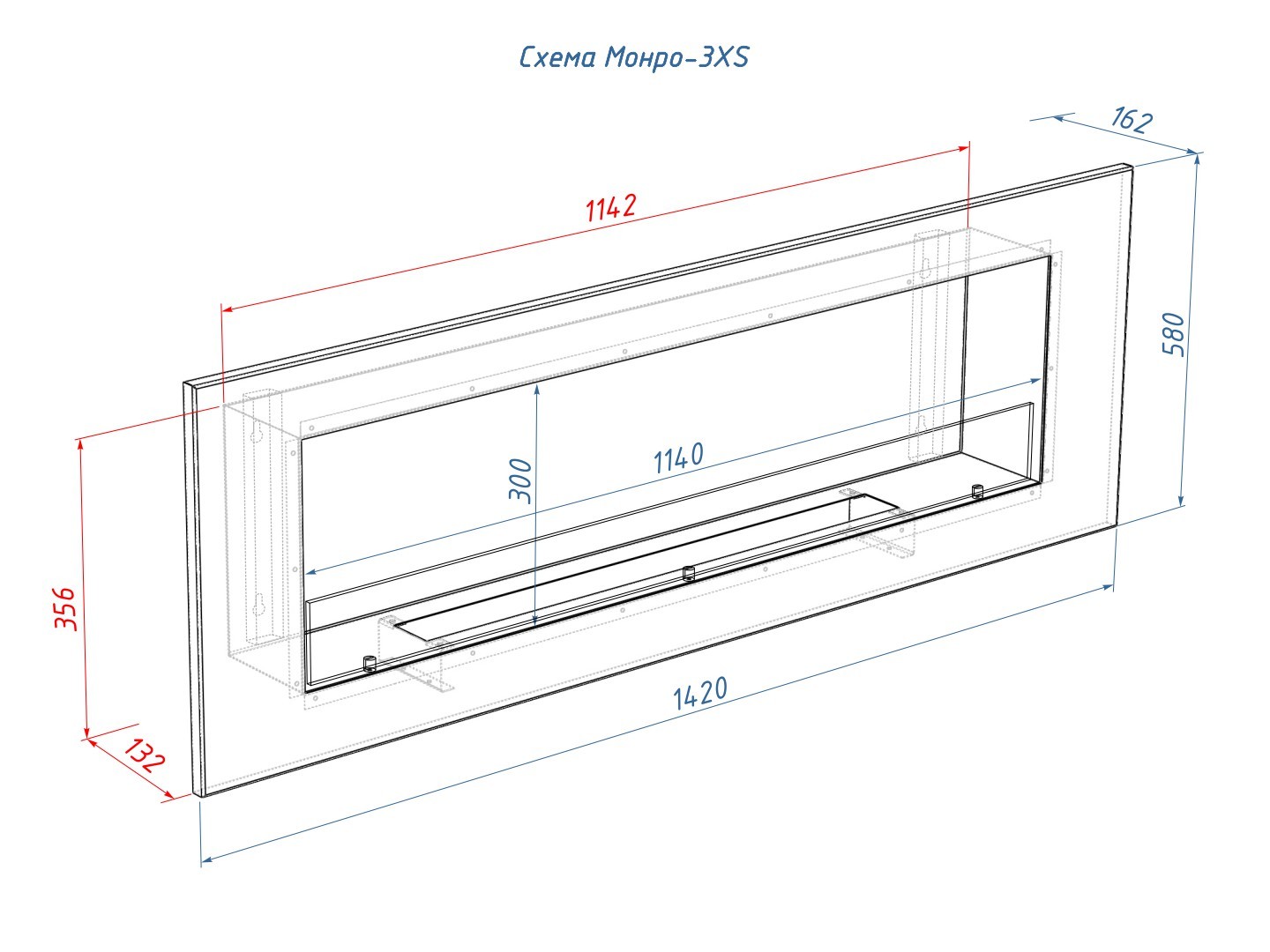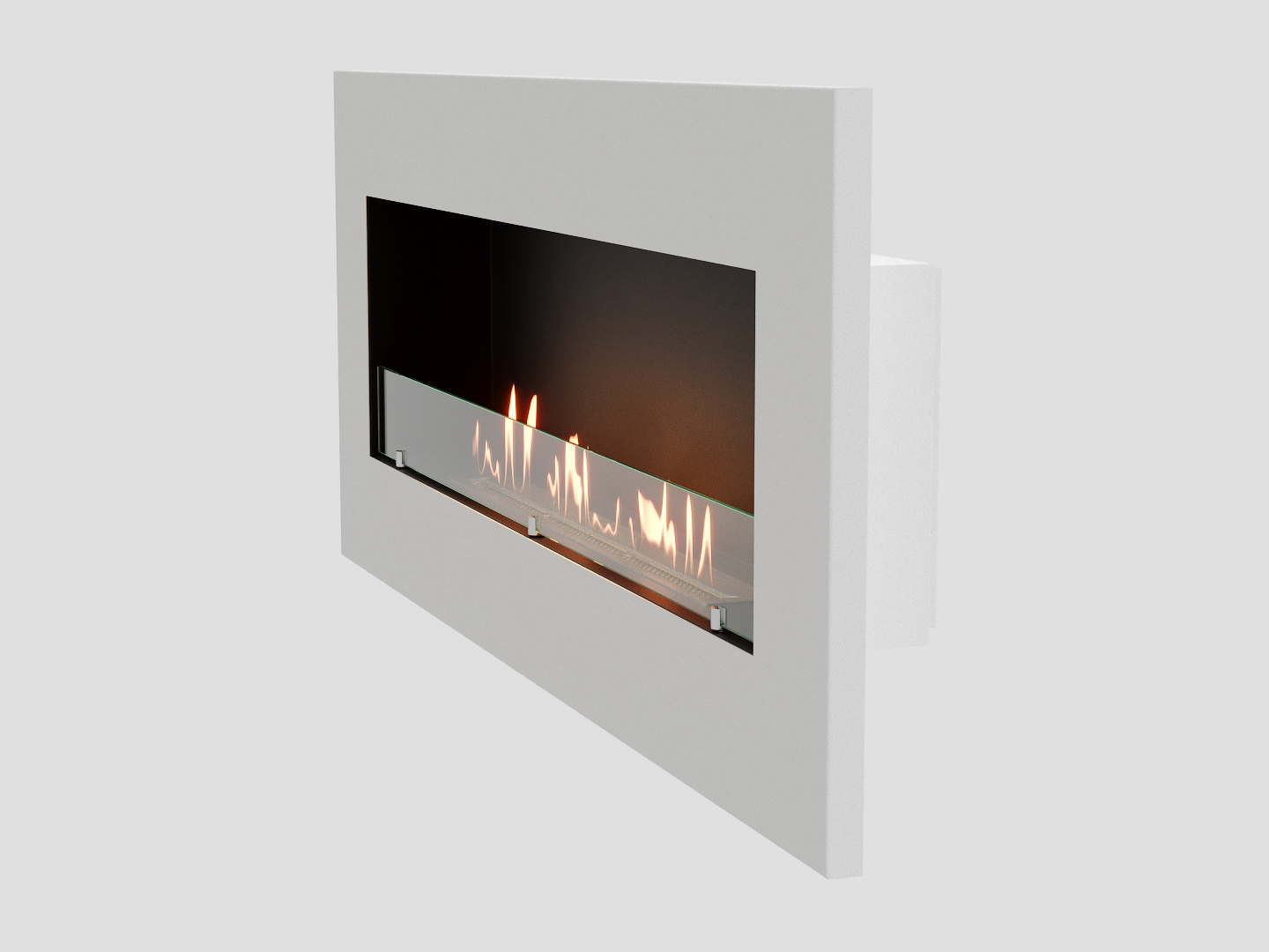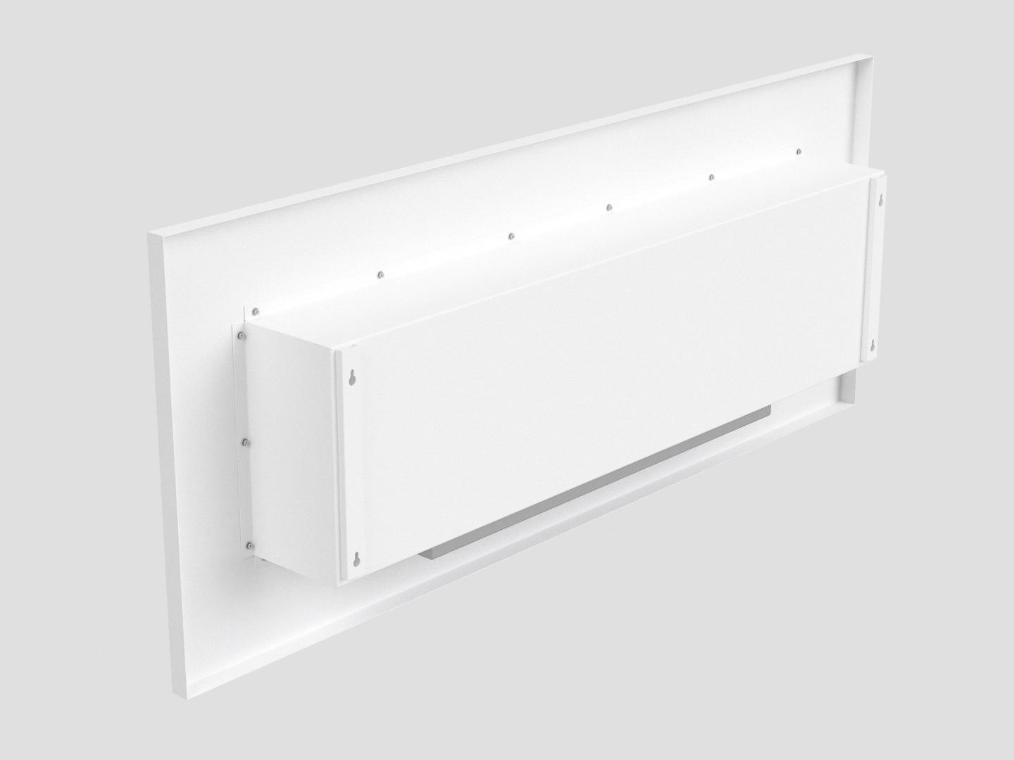 Представляет собой цельную металлическую конструкцию белого цвета класса XS, создающую полузакрытое безопасное пространство для огня с топливным блоком Lux Fire 750 XS ограниченную закаленным стеклом в котором горит живой огонь с углом обзора 180 градусов. Универсально подходит для встройки в нишу или подвеса на стену.