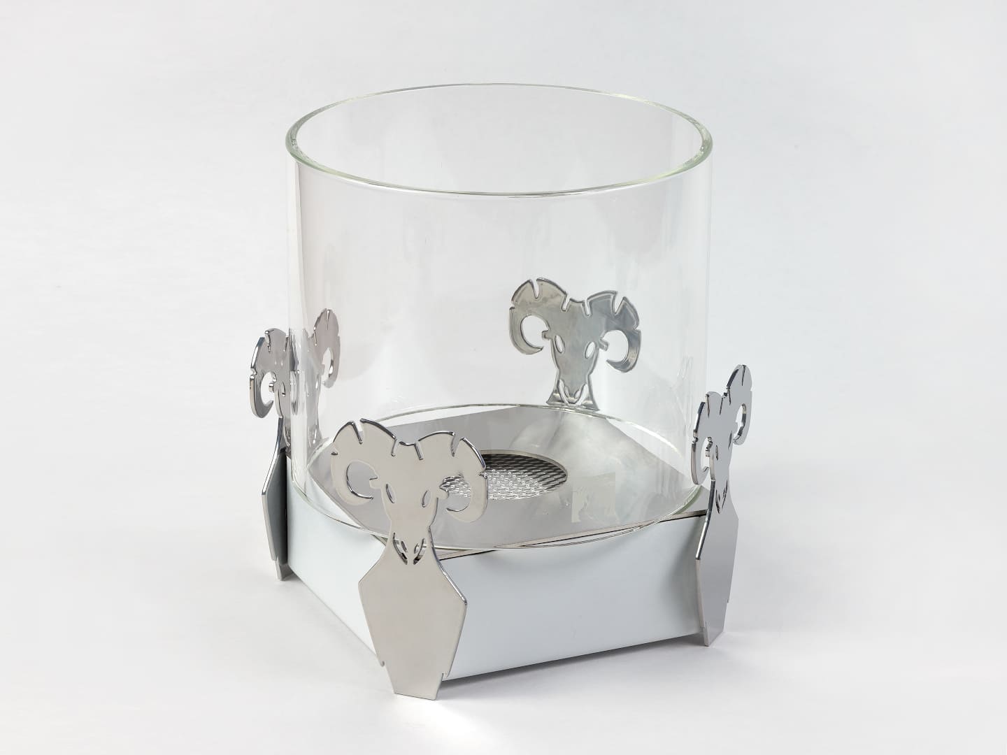 Представляет собой металлический внешний корпус с встроенным топливным блоком Lux Fire 150-2 на декоративных ножках в виде Овна. Огонь ограничивается стеклянным закаленным плафоном диаметром 180 мм.Среднее время горения 3 часа