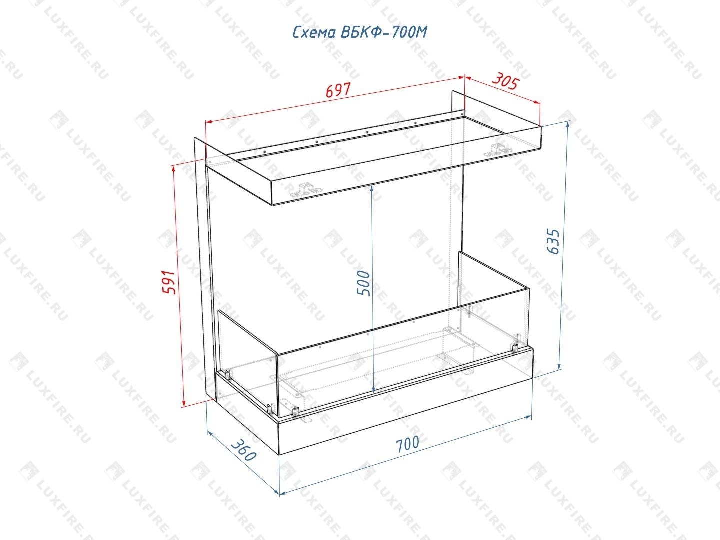 Представляет собой сборную металлическую конструкцию класса М, способную создать полуоткрытое безопасное пространство для огня c топливным блоком Lux Fire 500 М ограниченную закаленным стеклом с трех сторон в больших помещениях от 24 м2